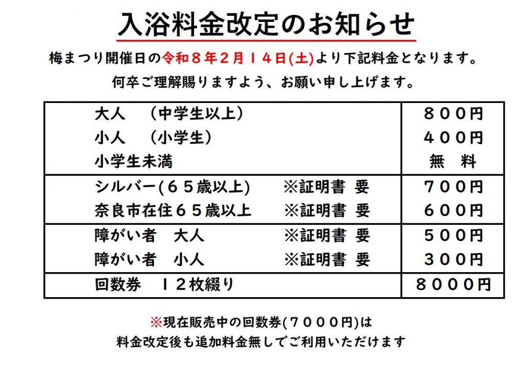令和8年2月14日(土)より、入浴料金の改定をさせて頂きます。