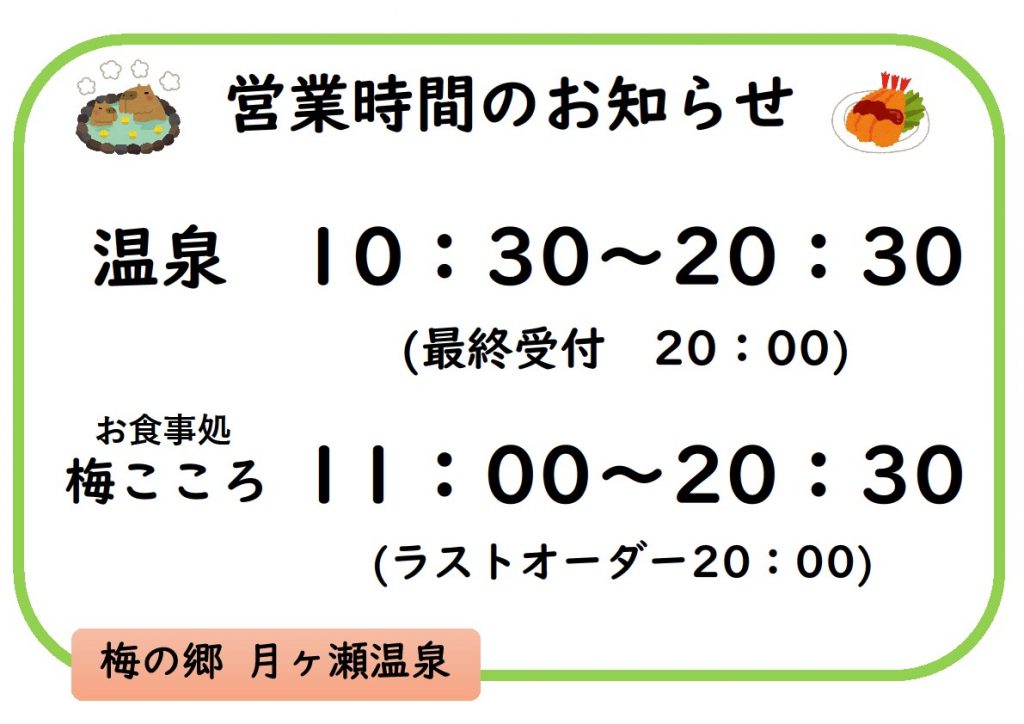 温泉の営業時間は変更ございません。(10時半オープン、20時受付終了、20時半閉店)